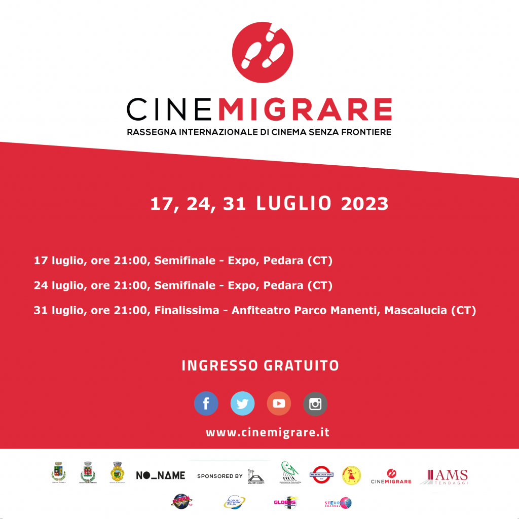 CATANIA – Un nuovo appuntamento con il cinema sotto le stelle, tutto pronto per la VII edizione della Rassegna internazionale di Cinema senza Frontiere, CineMigrare, insieme al concorso di cortometraggi Sicily International Short League, che si svolgeranno il 17, 24 e 31 luglio. Prodotti dall’Associazione Culturale NO_NAME, con il patrocinio dei Comuni di Pedara, Mascalucia e Gravina di Catania e in collaborazione con le Associazioni Culturali Gravina Arte, Mascalucia DOC e Pennagramma.